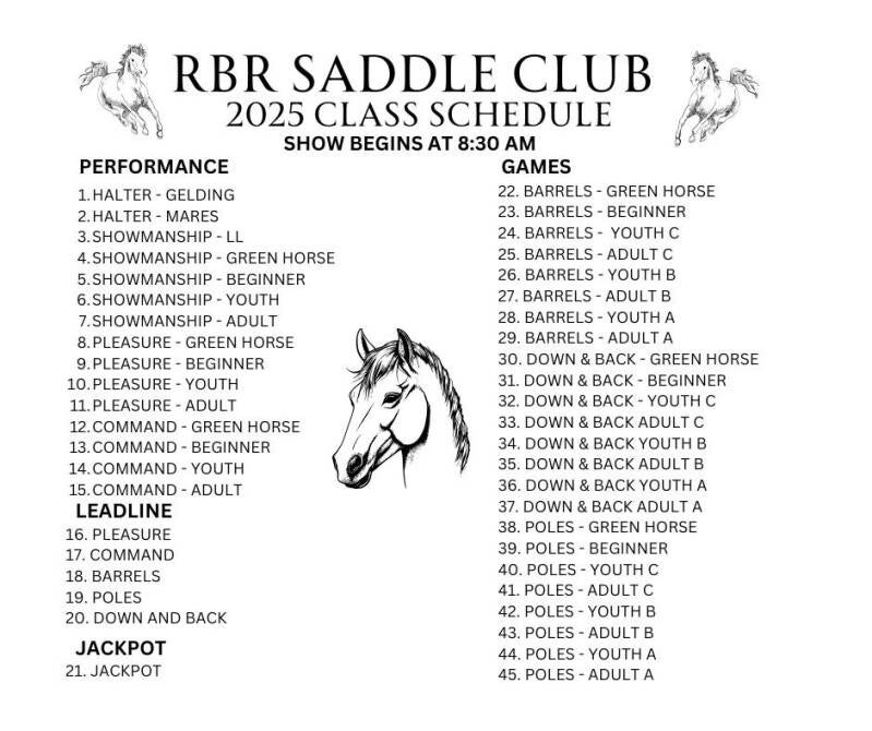 The RBR Saddle Club is a family-oriented horseback riding club that welcomes all levels of riding experience as well as all ages to participate.